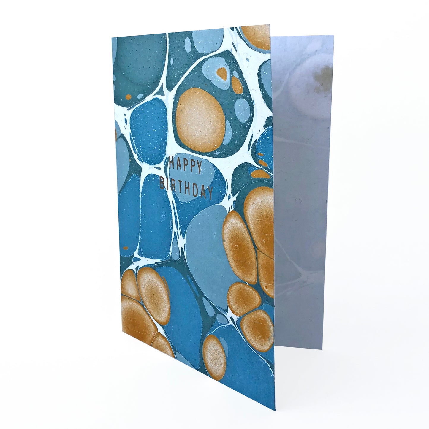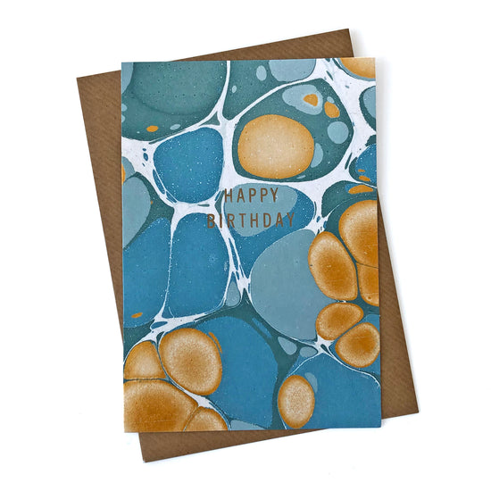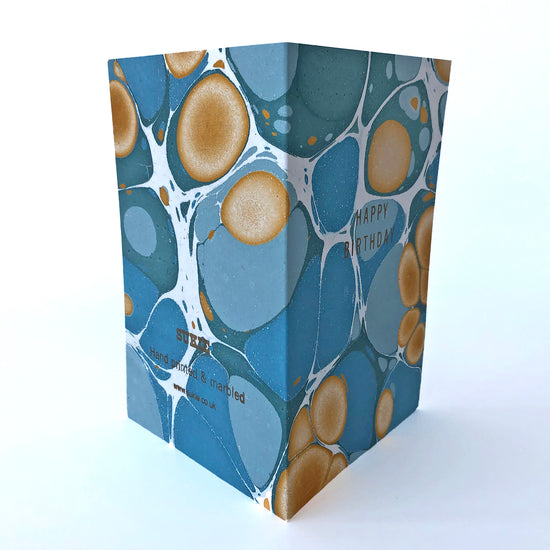 Hand marbled greetings card with greens, gold & blues marbled design and gold letterpress type HAPPY BIRTHDAY.