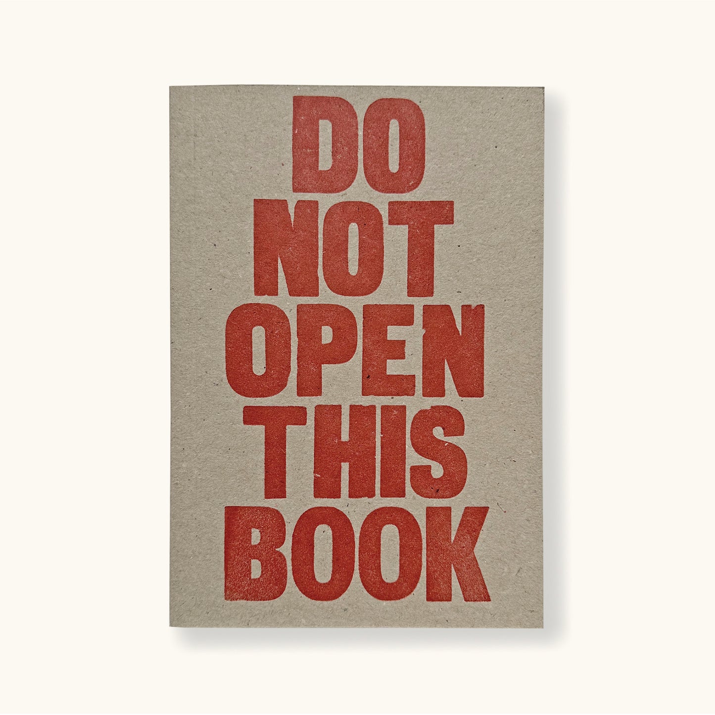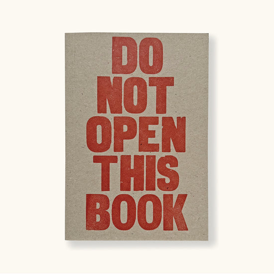 A Letterpress notebook hand printed in the Sukie studio on grey board, with the words DO NOT OPEN THIS BOOK letterpress printed in red ink on the cover. Self-explanatory, these boldly printed words should serve as a warning, and are sure to guard against inquisitive minds.