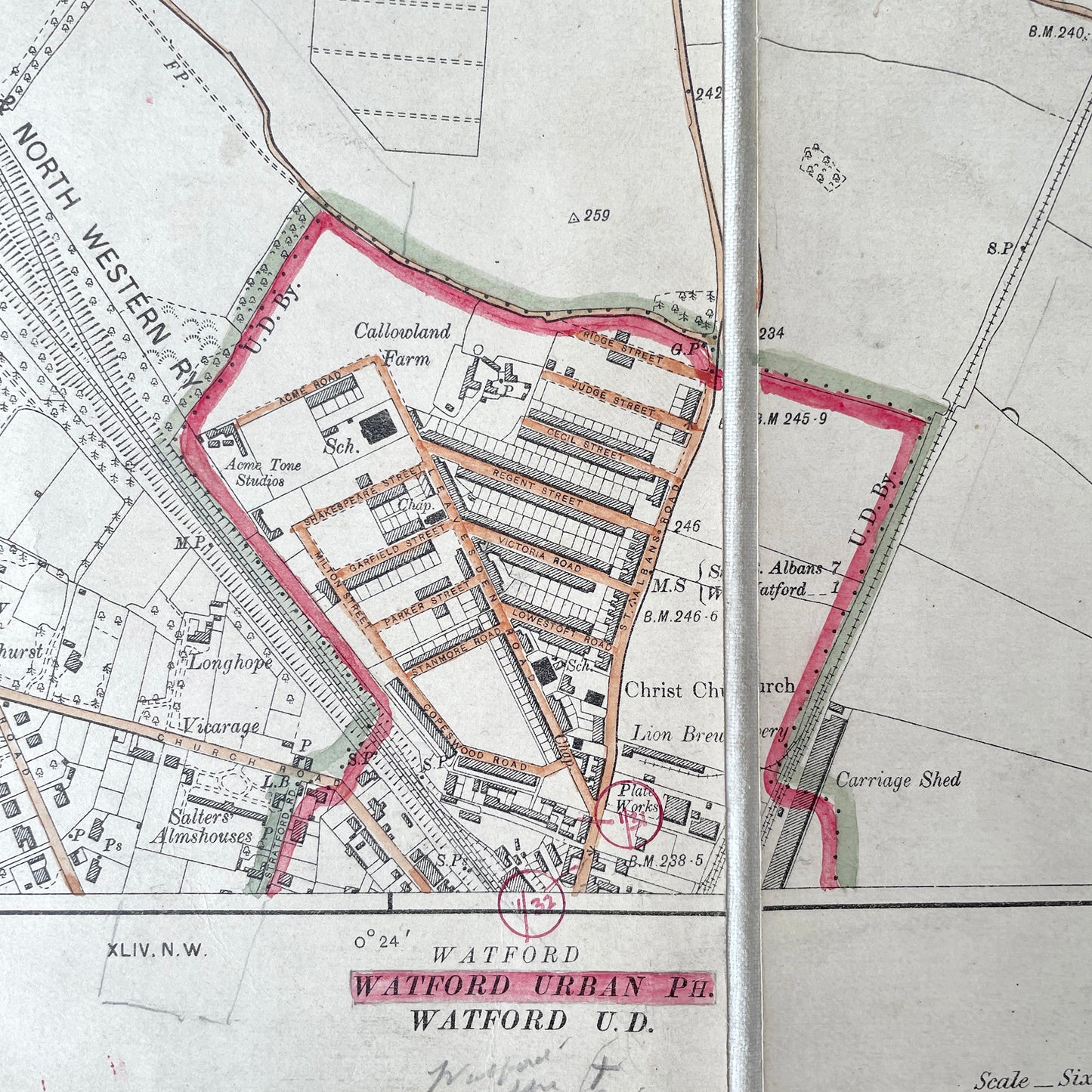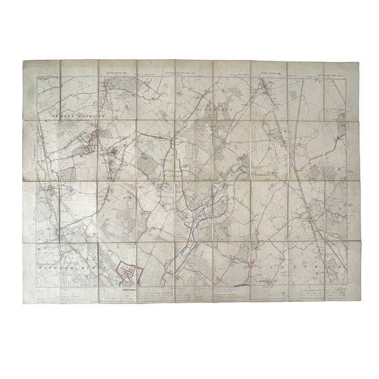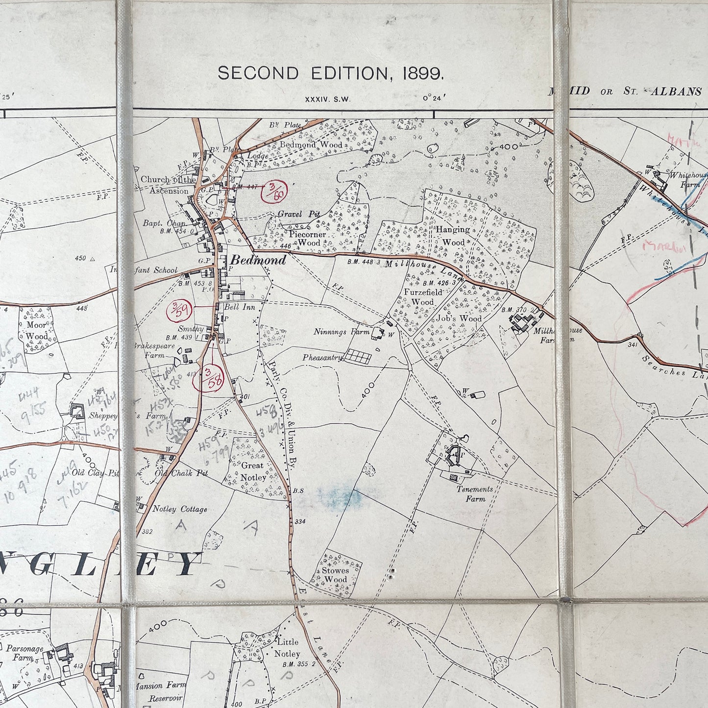 Beautiful, large, linen backed Ordinance Survey map of part of Hertfordshire dated 1905. Shipped folded.