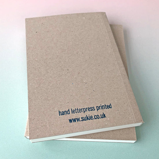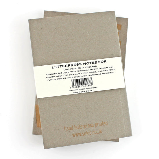 A Letterpress notebook hand printed in the Sukie studio on grey board, with the words good / bad ideas letterpress printed on the cover in blue and red ink. Its great to write down all your ideas, but not all ideas are good ideas – sometimes you can’t tell until its written in black and white.