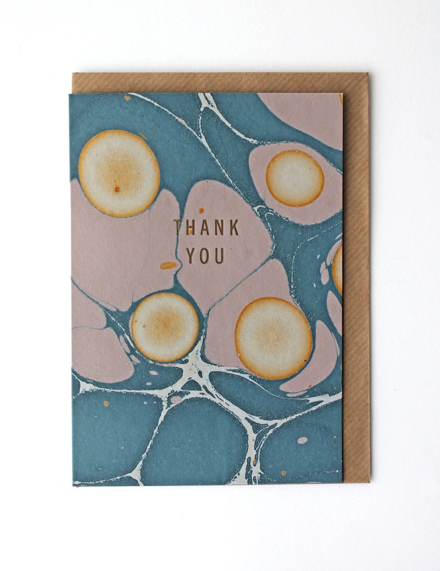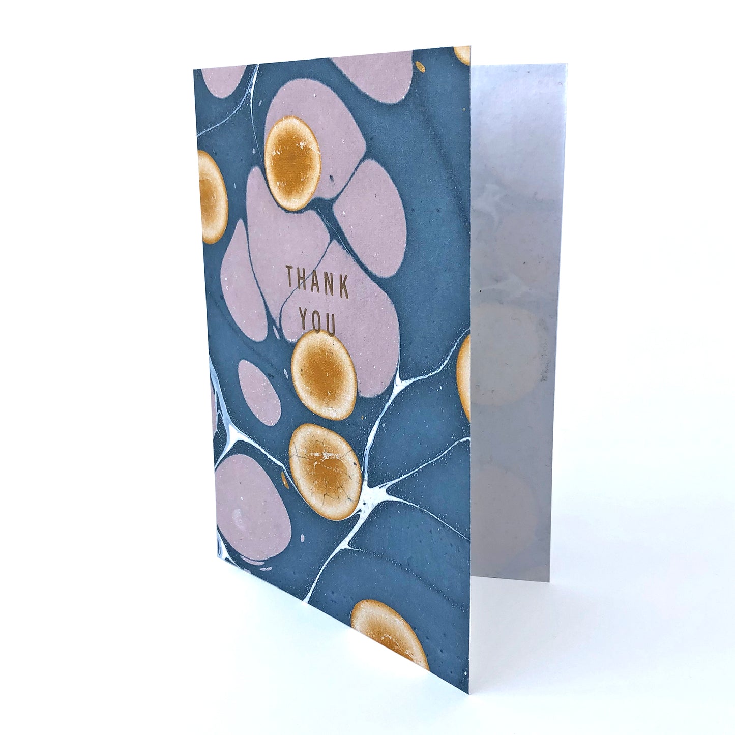 Hand marbled greetings card with a blue, pink & gold marbled design and gold letterpress type THANK YOU.