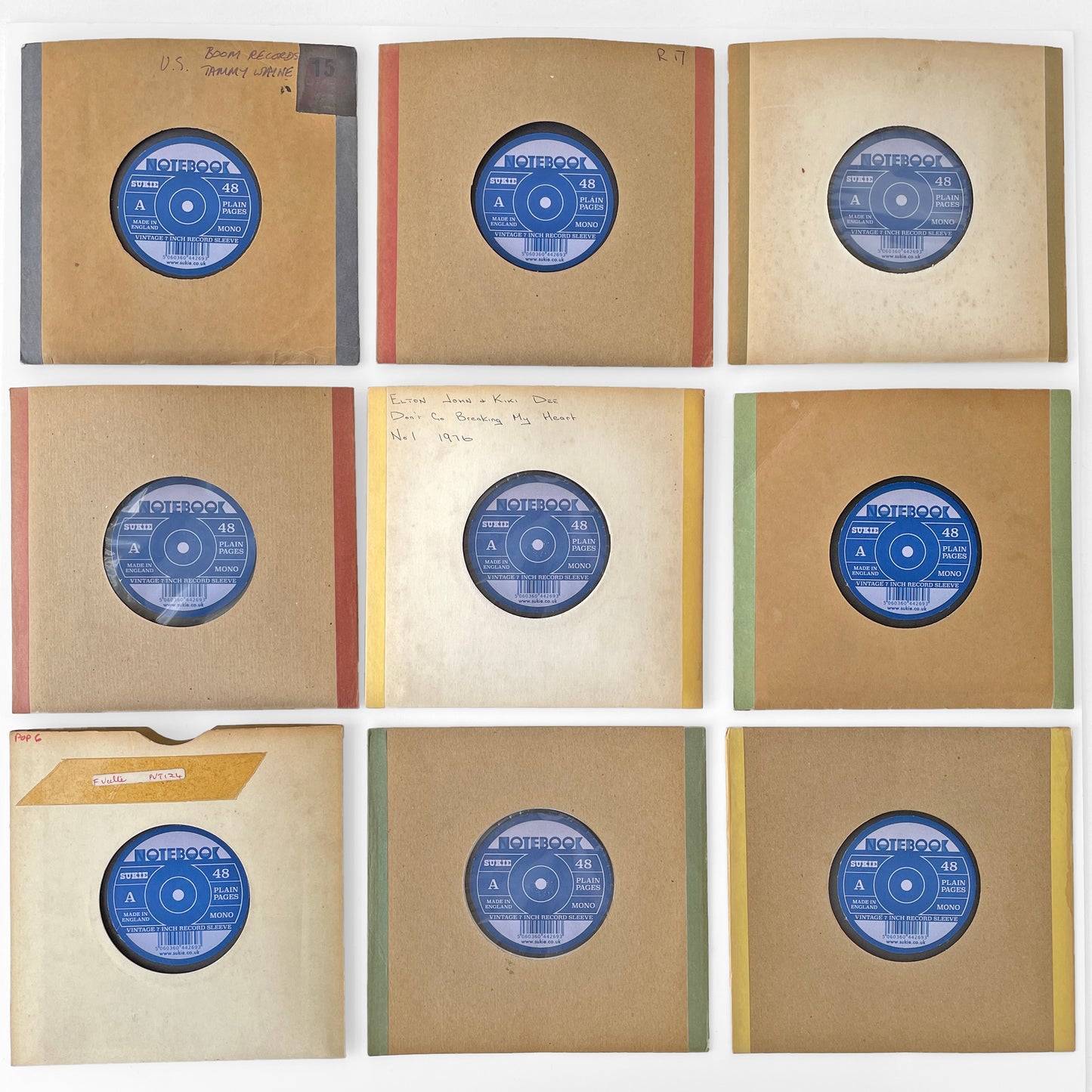 The book comes in an original vintage 7' sleeve - each one is unique and may have coloured tape and hand written notes - usually with the name of the single - a little piece of history.  We think these sleeves are from record shops or radio stations.